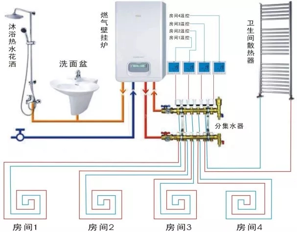 完整的水地暖系統(tǒng)離不開熱源、控制、管道、保溫四大部分。采暖壁掛爐是地暖的熱源中心,滿足地暖整個系統(tǒng)運行所需的熱量;保溫層、反射膜、采暖管道、回填層等地面部分保證系統(tǒng)的保溫效果;分集水器和溫控器維護系統(tǒng)的正常運行。
